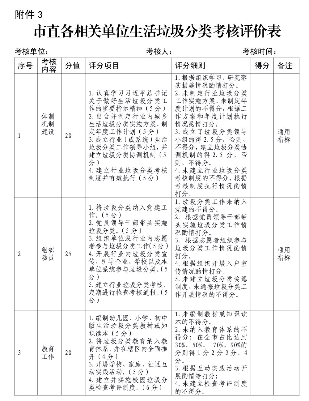 3.市直各相關單位生活垃圾分類考核評價表