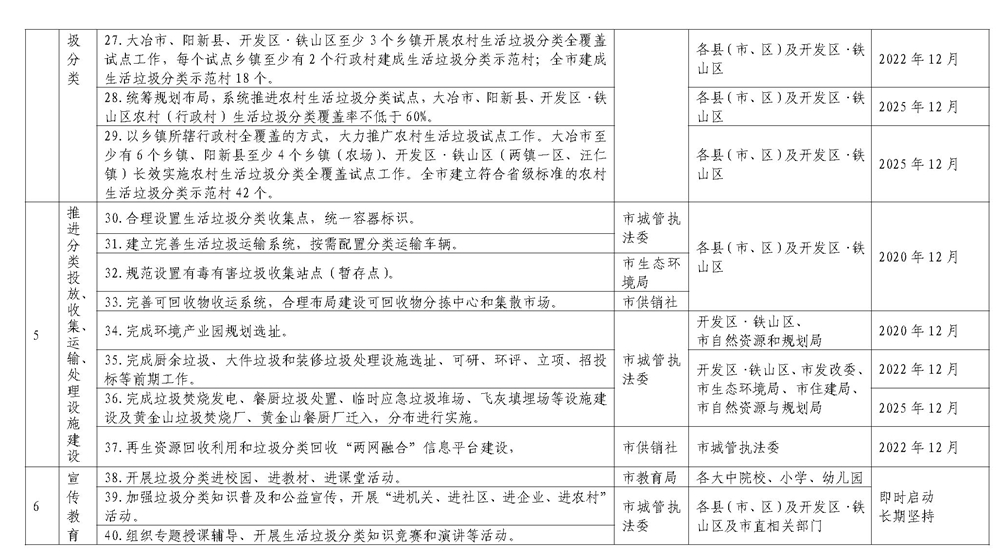 1.到 2025 年,各城區及開發區·鐵山區基本建成城鄉生活垃圾分類處理系統;大冶市、陽新縣建成區基本建成生活垃圾分類處理系統。